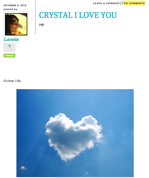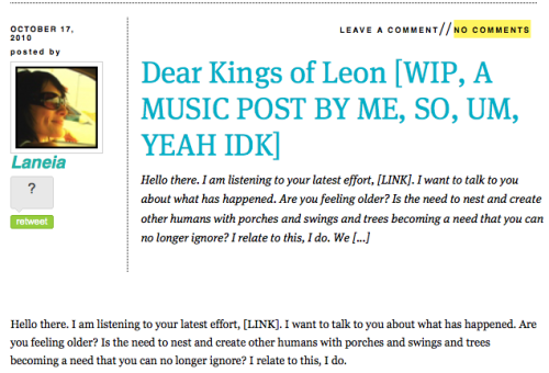 I imagine Laneia constructed “Dear Kings of Leon” in a moment of very passionate feelings about, it appears, Kings of Leon’s latest album. Laneia’s title-note is laced with self-deprecation regarding her perceived inability to complete a “music post” herself. Laneia is one of those people who gives you something awesome while warning you that it sucks.