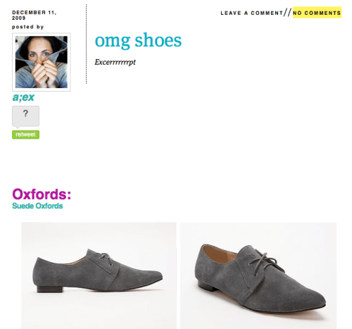 We are unable to move “omg shoes” to the trash, because it’s much funnier to ask for progress reports on “omg shoes” at every editorial meeting. We will never delete it. One day, I think, Alex will wake up with her socks on, look around the room, think “OMG SHOES!” and start pounding out this sucker lickity split. You know what I’m saying? You do. You get it. I know you get it.
