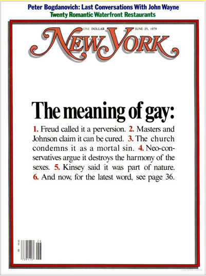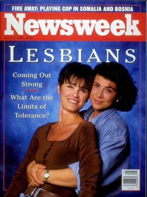 The problem is, it turns out, that people really don’t like to put ladies on magazine covers and finding 50 ICONIC covers was hard! Turns out that by “gay,” everyone means “dudes.” I know this comes as a giant surprise to you, my friends of all genders and sexual orientations — but literally every major mainstream-magazine’s BIG STORY about gay people had DUDES on the cover with a special emphasis on white dudes. Whether it was published in 1977 or 2011, stories about gay people in genreal are illustrated by dudes.