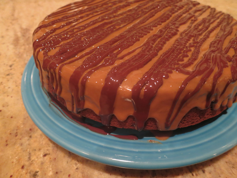 9. We’re almost done! Now you want to take your dark chocolate and melt it in the microwave (or on the stovetop I guess but the microwave was quick and easy and my preferred method). Pour the melted chocolate into a ziplock bag (or a fancy pastry bag apparatus if you have one) and cut a tiny hole in one of the bottom corners of the bag. Use this makeshift pastry bag to drizzle chocolate all over the top of the cake – you can go for any pattern but I copied the original recipe and aimed for lots of thin lines. They were a little shaky – I accidentally used my left hand instead of my right and once you start going it’s kind of hard to stop and start – but everyone who saw the cake insisted the “wavy lines” looked beautiful so I just started pretending they were intentional.
