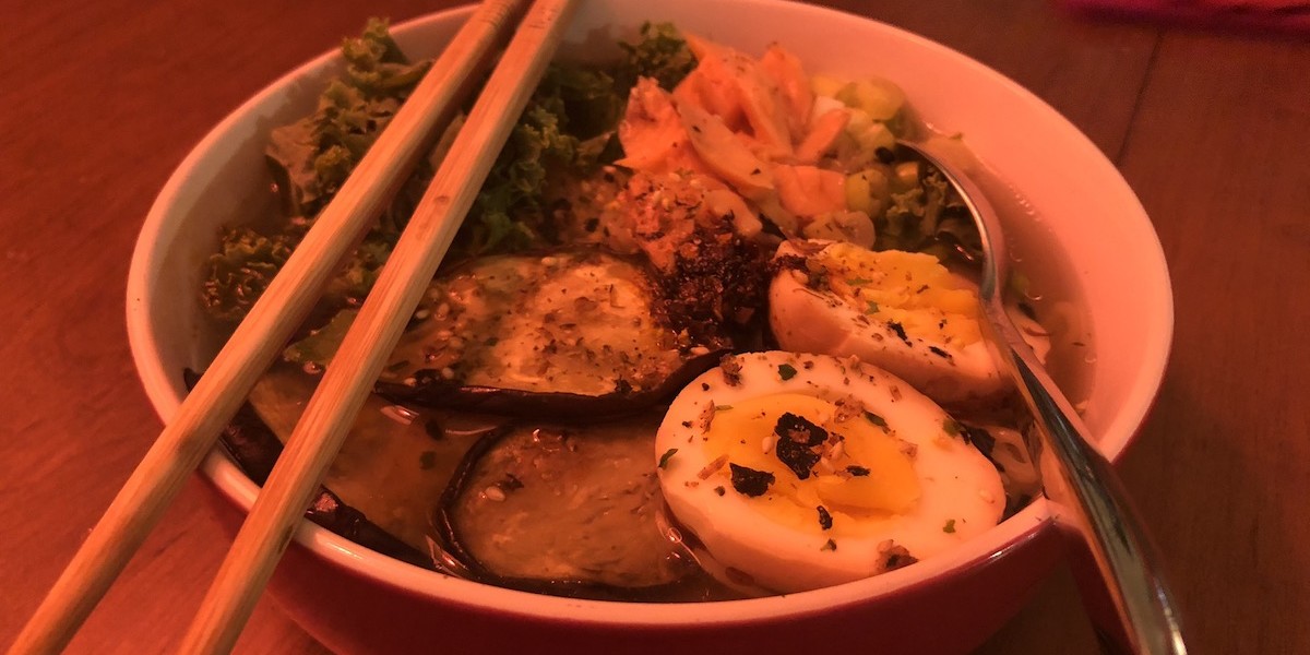 For my festive evening, I went with shoyu Sun Noodle ramen, salmon, an egg, slices of roasted eggplant, sliced up kale & green onion, Sichuan chili crisp for soup spice, and furikake for crunch!