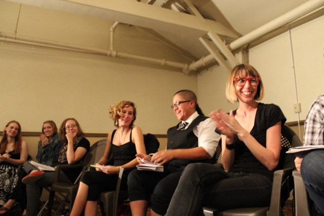 Riese: Everything looked perfect, everybody was in black and Katrina and Gabby were extra-dapper  and I actually started to feel anxious in a good way — anxious to tell my story and see if it mattered to anybody, but I was anxious to hear everybody else too — especially those I’d had to strongarm into participating ’cause they’d never read before, like Laura, Katrina and Laneia. I was eager to see them show themselves what they could do, and what I’ve always known they could do.