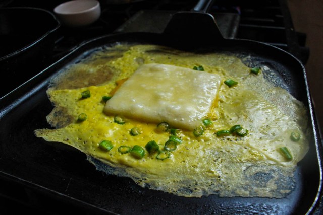 For fried: I do the Smitten Kitchen bodega-style egg, which involves beating an egg with a little water to thin it out and cooking it on a flat nonstick surface like a crepe, throwing a slice of cheese on there, and folding it up with the cheese inside to form a gooey little pocket. As you can see, I cook mine for longer than hers, so it’s less delicate and omelet-y and more crisp on the outside, so you get some crispy cooked egg and melted cheese. You could also, if you’re really into runny yolk, just fry an egg and flip it over to cook the other side and throw a slice of cheese on top of it in the pan.