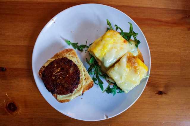 Optional! I’ve been using the Beyond Breakfast Sausages because I am vegetarienne and I like them better than the Morningstar ones, but you could of course also use bacon, ham, Canadian bacon, actual sausage, leftover chicken tinga, whatever you’ve got. If you have more patience than me, marinated pan-seared tempeh is great here.