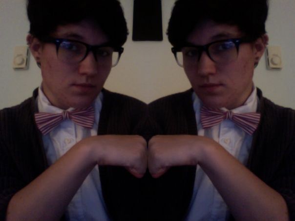 “I acquired sweater #1 from a friend. It has leather triangles sewn into the pattern and it’s a little bit too big for me. I wear it with lil black skinny jeans and run around like I am a four year old. Sweater #2 is a vintage 80s Calvin Klein sweater I stole from my uncle. I can wear it over everything but something about a bowtie really completes it.”