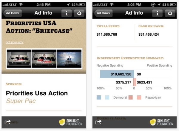 Ad Hawk is an app that will listen to a political ad on the radio, on TV, even on YouTube and it will identify the ad and tell you who paid to make it happen. It’s like Shazam for politics. And what with the Citizens United Supreme Court decision that lets corporations (and whoever, really) spend unlimited amounts of money in campaign donations for just such media blitzes, this app is pretty necessary to be an informed voter this election season. That thing is telling Hispanic voters that Romney is on their side? Well, who paid for it? And why are they lying?