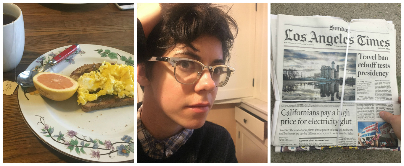 Then I go outside and collect the daily paper from my driveway. That’s right, kids: I still get the newspaper! As paper! Mostly because I like doing the crossword puzzle by hand, but it’s also nice to catch up on news without having to spend even more time on my goddamn phone. I’ve really tried to cut back on gazing at screens this year because it helps me avoid Trump Despair and the newspaper is a great tool for that. I’m not actually a day behind in news because yes, I still use the internet, but doing in-depth dives at night or the next morning instead of INSTANTLY OH MY GOD TELL ME RIGHT NOW has boosted my mental state a thousand percent.