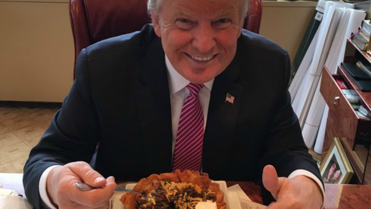 Two days after becoming the Republican nominee for president, Donald Trump tweets a photo of himself eating a taco bowl, ostensibly in the Trump Tower Grill. The text of the tweet reads “Happy #CincoDeMayo! The best taco bowls are made in Trump Tower Grill. I love Hispanics!” The Trump Tower Grill does not have taco bowls on their menu. It seems that they are offering a special one-time-only “taco fiesta” for Cinco de Mayo.