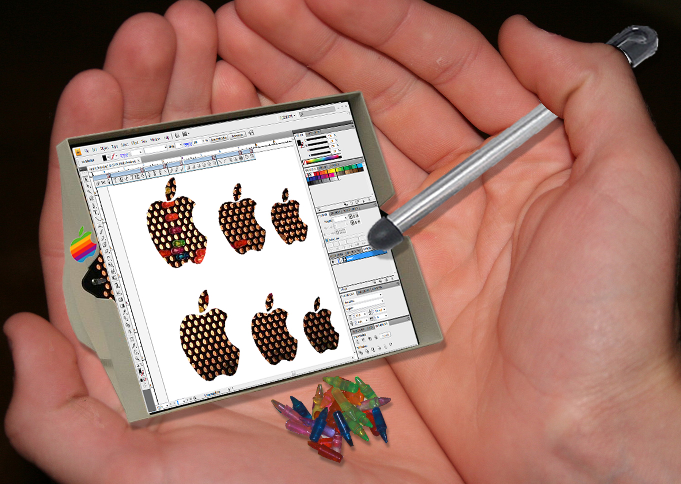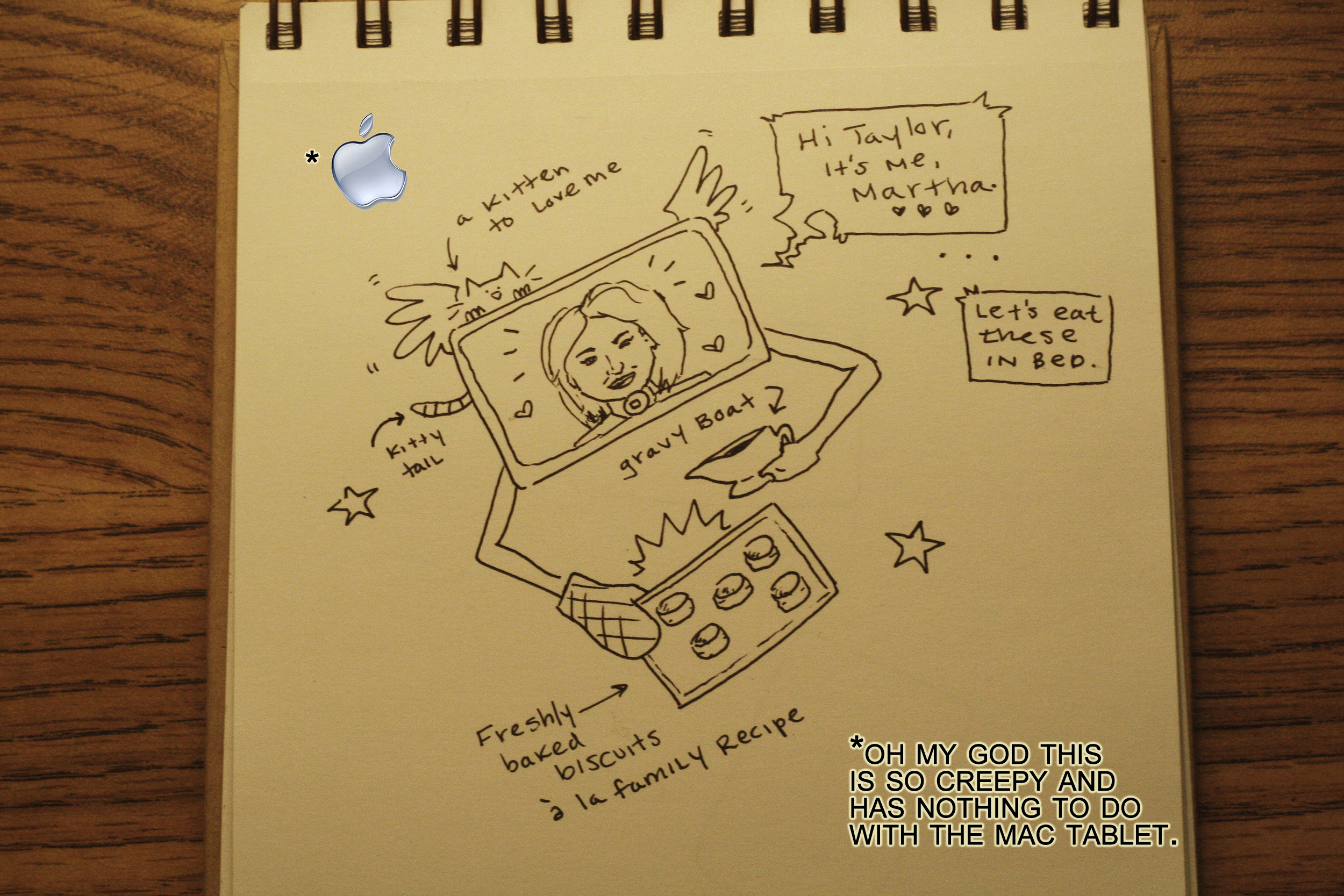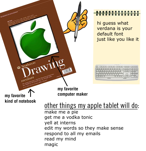 So, here it is! Our completely top-secret glimpse into the mystery of Apple tablet, the iSlate, the iPhone grande, the flat-Macbook-thinger-of-my-dreams! We hope our exclusive concept art, which is exclusive in that it is exclusively really, really weird, makes the wait ’til 10am PST next Wednesday the teensy-tiniest bit more bearable. Enjoy!