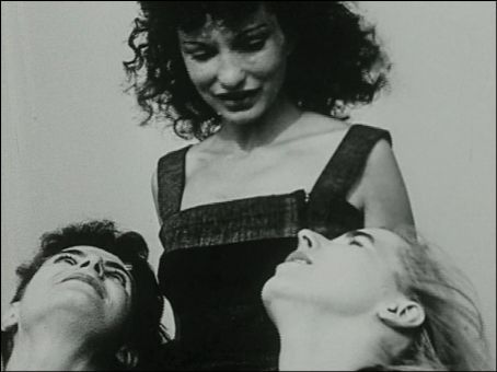 The benches didn’t have backs. They were also all completely occupied. I slumped down to the floor and groggily peered up to where a black and white movie was being projected over the sea of people. On the screen, a woman with a dark mass of curly hair appeared at the window. She peered through the glass while another woman, down below on the sidewalk, chased after a hooded figure. As she turned up some steps a face was revealed, and we saw that the woman at the window was mired in some sort of repetitive lucid daydream.