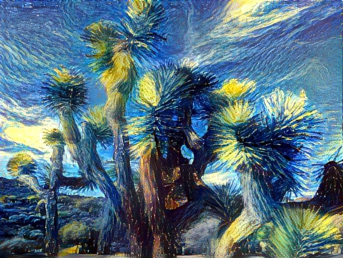 Google Deep Dream started from the ground—it learned to identify objects by painstakingly scanning millions of photos, pixel by individual pixel. Then it learned to distinguish those objects from each other. Then it learned to group objects and output them into these trippy digital paintings, teaching us more about what neural networks “see” when they look at an image. The results are so idiosyncratic that Deep Dream has had its own art show. You, too, can upload an image to the Deep Dream Generator and see what a neural network sees when it looks at your photo. If that’s too creepy for you, you can take a look at the greatest hits gallery. Here, I did it with one of my photos from Joshua Tree. It thinks Joshua Trees are peacocks.