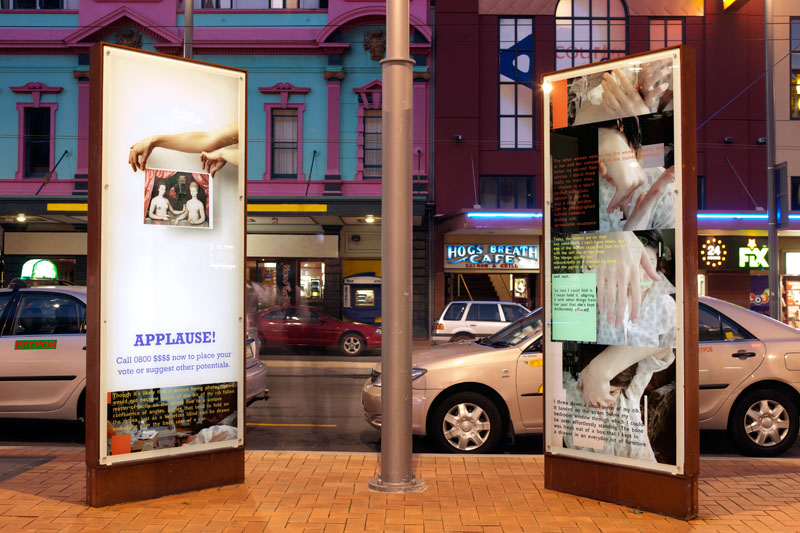 Rachel: Our project launched the cultural wing of the 2nd AsiaPacific Outgames, where 2000 international visitors came to Wellington primarily to play sport and party. We knew there would be a queer audience for the work, but not wanting to make assumptions, we talked a lot about who the local/visiting LGBTQI viewing community would be. All n’ all, to get things going we decided to narrow our homosexual focus so to speak, and our starting point became ‘female same-sex experience’. We also decided to have as much fun as all the sporty people. What we really wanted was to start conversations. And we genuinely wanted to make work for a queer audience and focus on how communities are shaped by the desires and actions of the people involved, making them full of potential direction. We hoped an invitational tone would encourage dialogue rather than rehash stereotypes of belonging or difference.