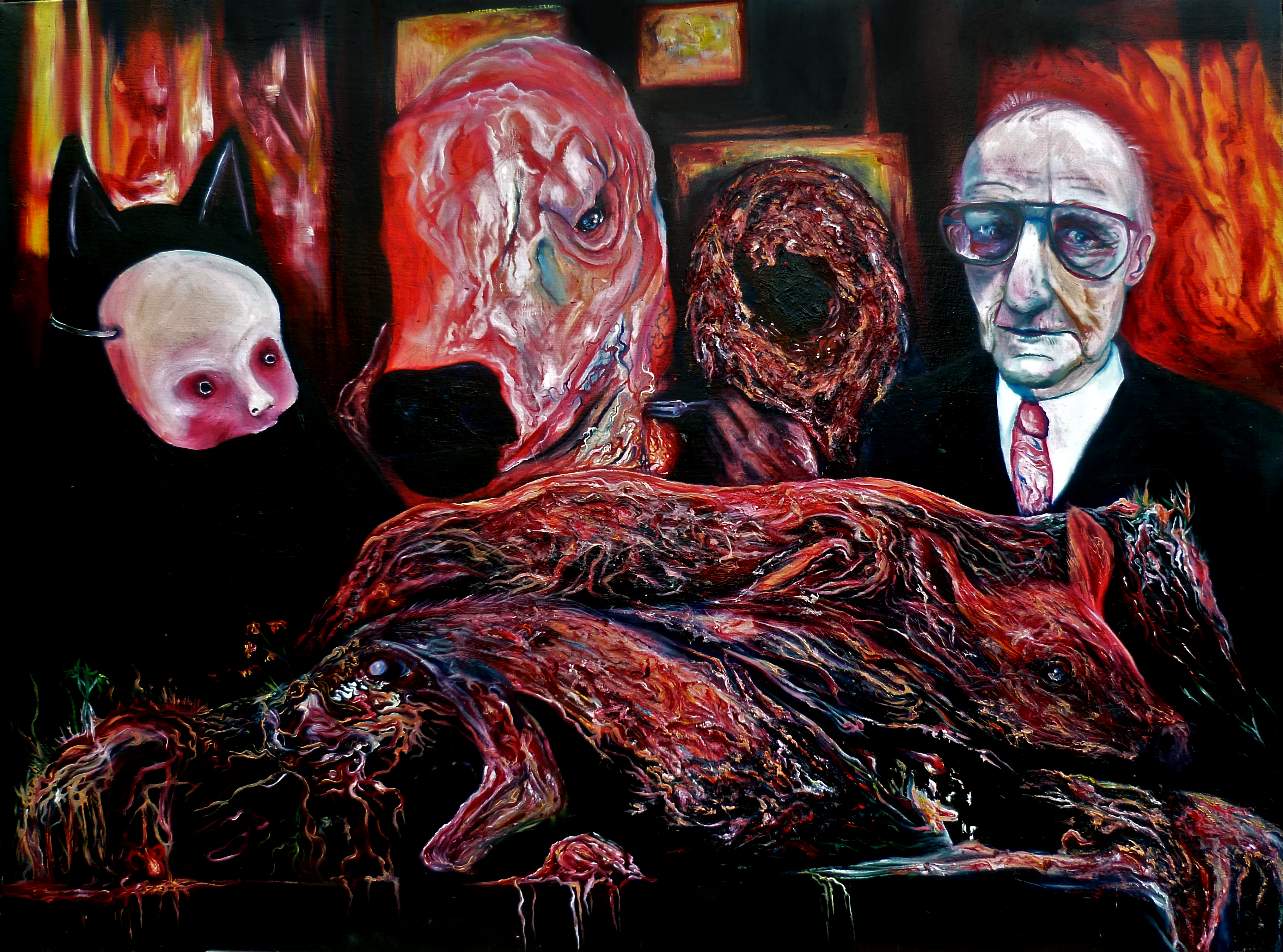 The experience sparked my fascination with the unseen processes of the living and dead organism, and how it could reflect the cycles of ancient and modern human civilizations. Living beings die, and their bone and flesh in turn nourish the soil, the insects, and the plants, which in turn nourish those that feed upon the vegetation. Death—and the energy released with it—is what sustains life itself. Even in death, we are not inert—there are always innumerable unseen processes at work, for death is not quite the end, merely a transition. We change from flesh and bone to soil and nitrogen, and the energy within our atoms is always recycled. Living and dying are two faces of the same vast process, one that ensures the continuous propagation of its own existence with an inexorable equilibrium that modern society lacks. My studio practice draws upon these systems of growth and decay in order to hold up a mirror to our society, and its current state. We are a system rotting from the inside out, grown too large to sustain ourselves, and now we eat away at ourselves, like a cancer. My paintings show that decay as well as the potential for transformation and growth.