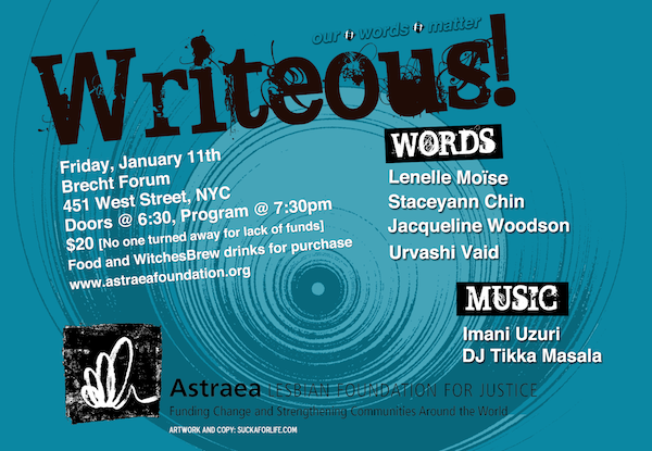 I’m hoping you can make it to Writeous on Friday, January 11th at the Brecht Forum? (NOTE: There is a new location for this event: Greene Space, 44 Charlton Street, New York, NY) It’s going to be a great night. We will have readings and performances by Lenelle Moise, Staceyann Chin, Jacqueline Woodson, Urvashi Vaid, and music by Imani Uzuri. And we always end with a gorgeous dance party, this year with DJ Tikka Masala, so you probably won’t want to miss out on this one.