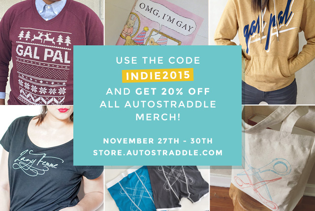 Anyhow, today is perhaps the best day in the history of days in which to shop the Autostraddle Store, because it’s your very last day to acquire the merch you covet for 20% off (just use code “indie2015” at check-out) and there’s a few other random markdowns to find throughout the store today only!