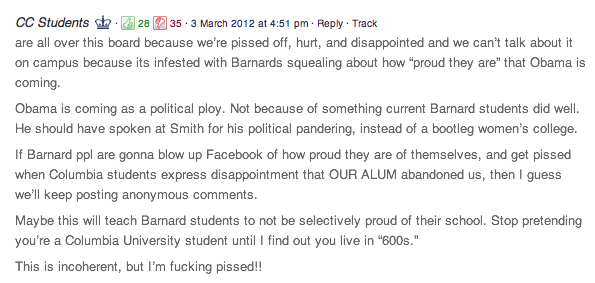 There are over 750 (and counting) mainly anonymous comments on the article that Columbia’s own bwog.com wrote—an article that merely announces the news that Obama would be speaking at Barnard. Many of the comments are full of scathing words about Barnard, Obama, Columbia, Women, and anything else that a stressed out college student could think to complain about.