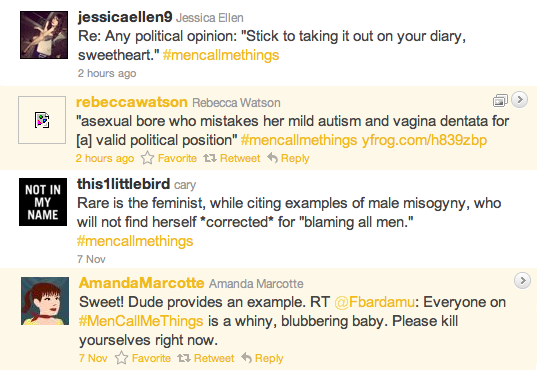 The Internet puts a lot of discussion that was once private into a public space. This applies to “men calling us things,” in that attempts to silence or denigrate us are now a pastime that can be shared by large groups of people in a public domain, with little to none of the consequences, even if they are only social, that might occur in a private space. But it also means that we have a platform to talk about it, and to call attention to our own marginalization. Misogyny is nothing new and neither are stories about it. We can still chat over needlepoint or plot the dismantlement of the patriarchy in consciousness raising groups, but now we’ve also got the Internet. We make friends, create spaces, and share ideas with people from all over the world–something that makes me happier than I can put into words. I can only imagine that the fairly permanent place that women’s voices are claiming in online discussion is threatening to the type of men who call Amanda Marcotte a “whiny blubbering baby” and suggest that she kill herself. Because while the things you can read about in #mencallmethings and the fact that it’s such a frequent phenomenon in the first place are reprehensible, it’s also a sign of the times. The vitriolic and hateful responses are a reaction to a scary and irreversible social change — the fact that women now say what they want, and what men call them for it can finally be a response, albeit an awful one, and not the whole conversation.