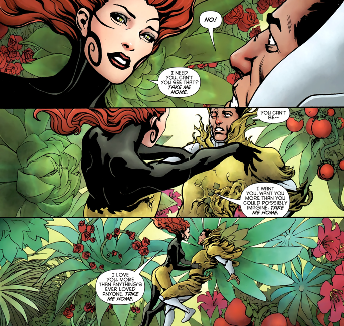 What else? Ev is constantly trying to set up Dinah with cute science researcher Trevor, who can’t possibly be so accomplished or knowledgeable at age 22 or however old he looks in this comic — and his first words to Dinah are “Huh? Wow,” at her sexiness before he addresses her as a person. Ev faints into men’s arms and feigns feminine delicacy to distract guards. And Poison Ivy’s main information-sapping tactic is a creepy plant seduction technique where she interrogates all of the informants (who happen to be all men) with phrases like, “I need you, can’t you see that?” and “I want you. Want you more than you could possibly imagine,” and “I love you. More than anything’s ever loved anyone.”
