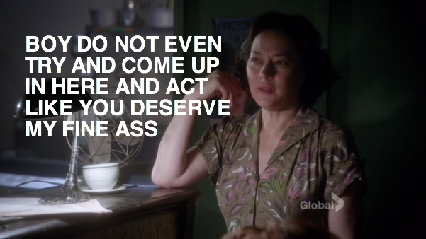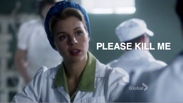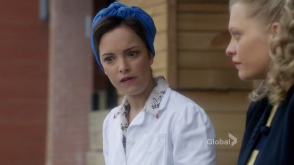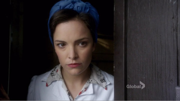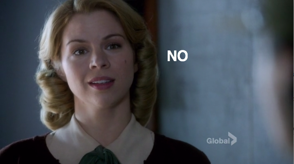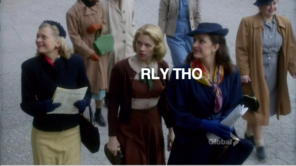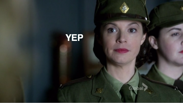Meanwhile on Chilly Housewives of Toronto, Lorna and Reggie are reading the morning paper and refreshing Hulu to see when the new episode of The Daily Show will be online. After hearing Jon Stewart’s bit about the Nazis taking down a civilian ship in Newfoundland, they are interrupted by the milkman, with whom Lorna is sharing a weirdly erotic moment. Did I mention the moment was erotic and weird? She gives him a hard time about where he leaves the cream, and the amount of tension is disturbing. Lorna literally says “naughty neighbors steal my cream.” Bomb Girls: the show that continues to go there even when you are not sure that’s a place you want to go.