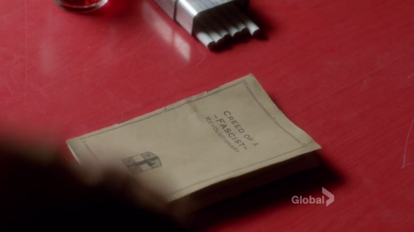 Somewhere in a car that is probably in the Greater Toronto Area, Terrible British Accent and Gladys are driving around talking about spy things. Terrible British Accent says that Marco is a security threat. Gladys is like, yeah, you and every other writer who has rehashed this narrative about five times this season. He hands her a file full of Evidence Marco Is Bad and tells her to look it over. SPIES!