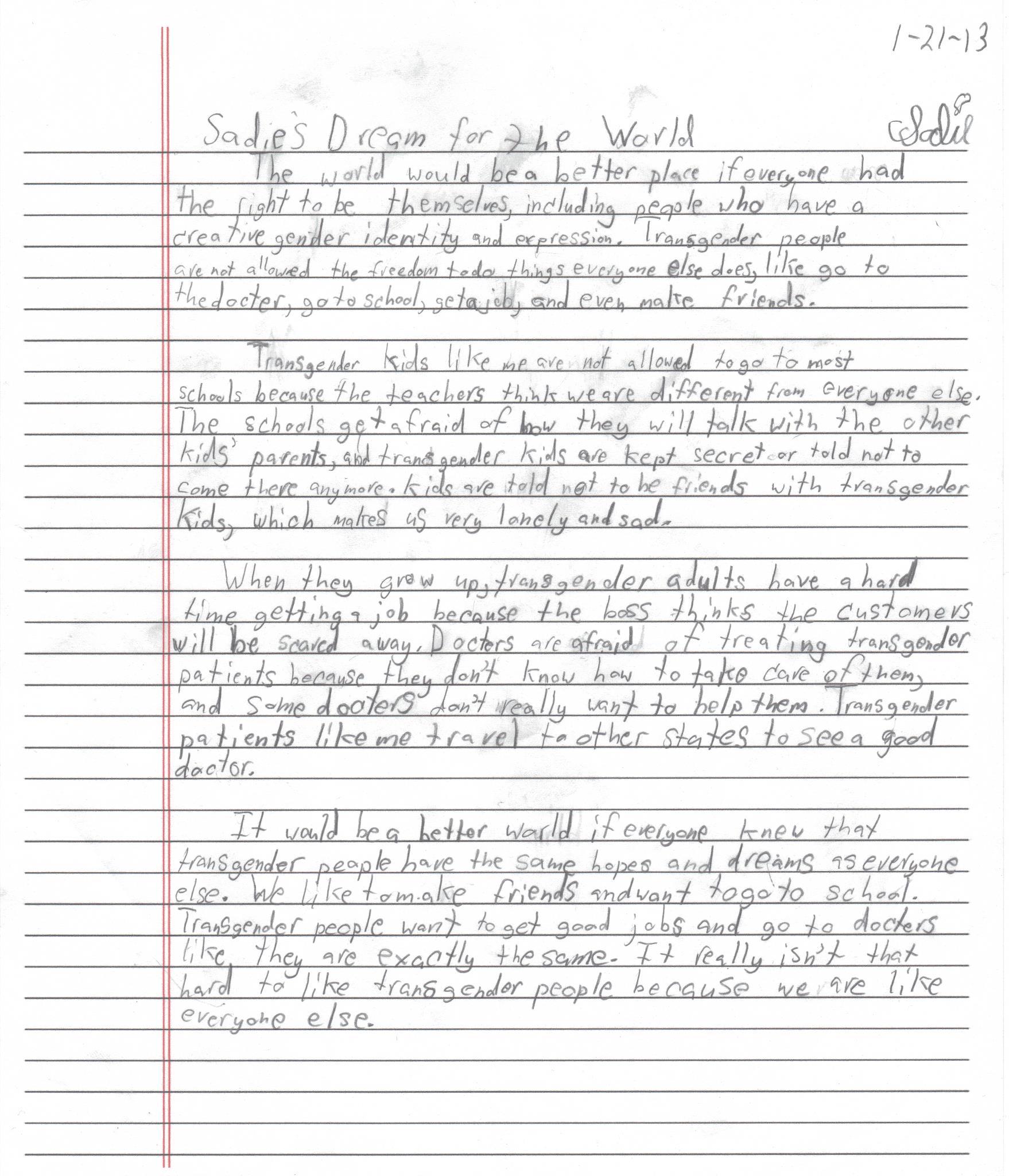 11-year-old Sadie Croft loved Obama’s speech but like a lot of other members of the LGBT community, she wondered where was the love for the T? She responded with an essay about building a better world for trans* people. The essay begins, “The world would be a better place if everyone had the right to be themselves, including people who have a creative gender identity and expression.” Noah Michelson, HuffPost Gay Voices Editor, discusses the letter during HuffPost Live.