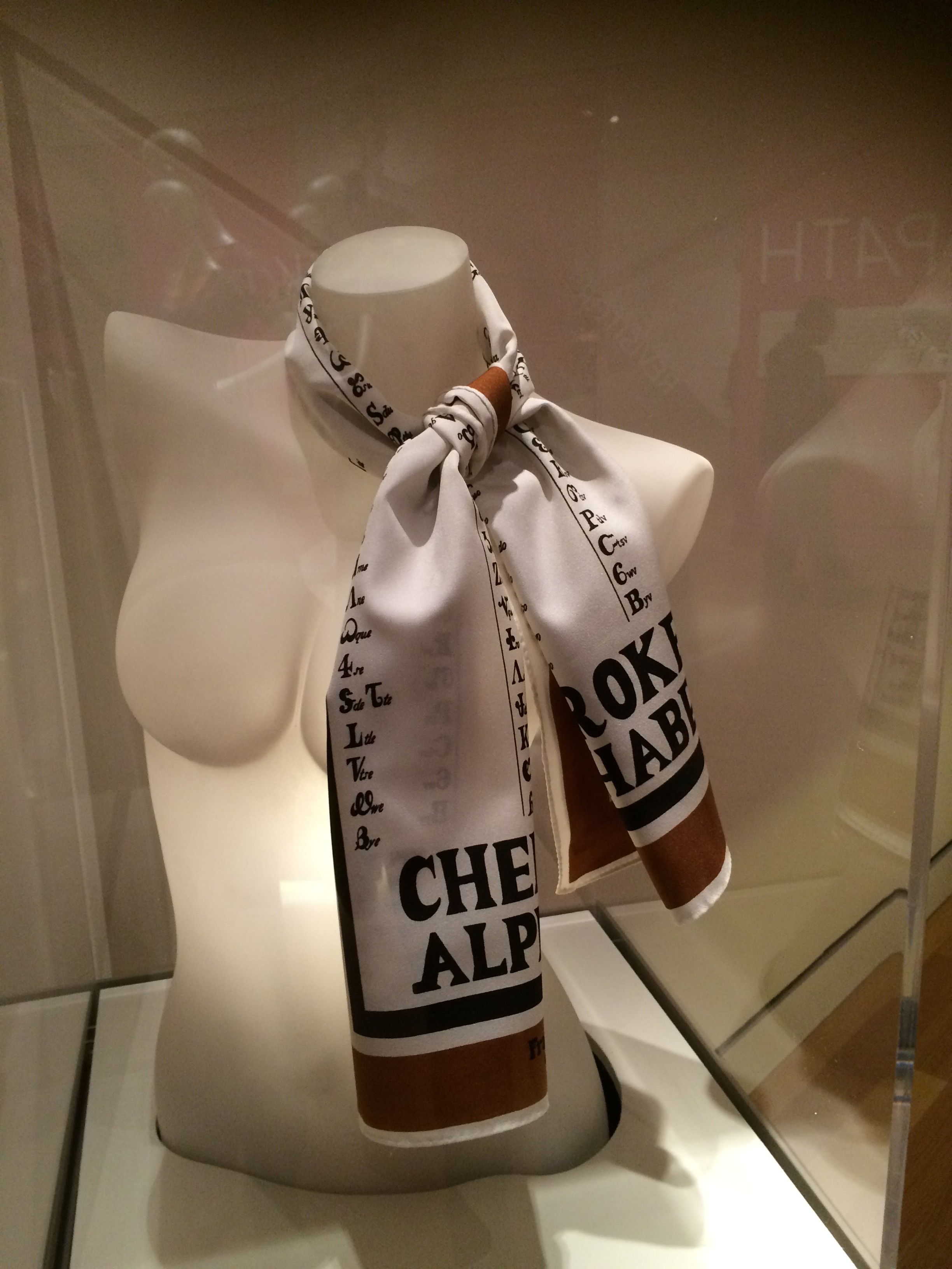 Lloyd Kiva New, Tsalagi (Cherokee), is credited as the “Godfather of Native fashion.” He was the first Native designer to gain recognition in the fashion world for his culturally inspired work. In the 1950s, he sold his customized designs in high end boutiques and Neiman Marcus across the U.S. Frankie Welch, Eastern Band Tsalagi, is a powerhouse in her own right. She’s best known for her impressive 2,000 scarf designs and for adorning the elite women of Washington DC in her work. Many of Welch’s designs feature the Tsalagi language — the first written Native language.