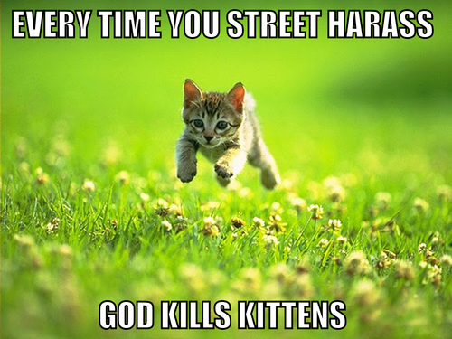 Take, for example, my most recent experience with street harassment. There I was at the grocery store when some man tells me to “smile, baby. you’d be so much prettier if you smiled.” I wanted to tell him I was only at the store because I needed some fucking dark chocolate for my terrible cramps and therefore didn’t feel like walking around with a damn smile on my face so I’d seem more attractive to him. I just uncomfortably grimaced and walked away with my chocolate. I wish I had one of these cat pictures printed out to throw at him. That’d show him!