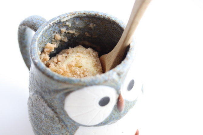 You know that primal craving that comes to you in the middle of the night(/morning/afternoon)? Those diabetic whispers that nestle themselves comfortably in your ear singing, “sugar, sugarrrrrrrrr”? Well, I’ve found a new way to satiate my need for simple carbohydrates and its name is coffee cake in a mug.
