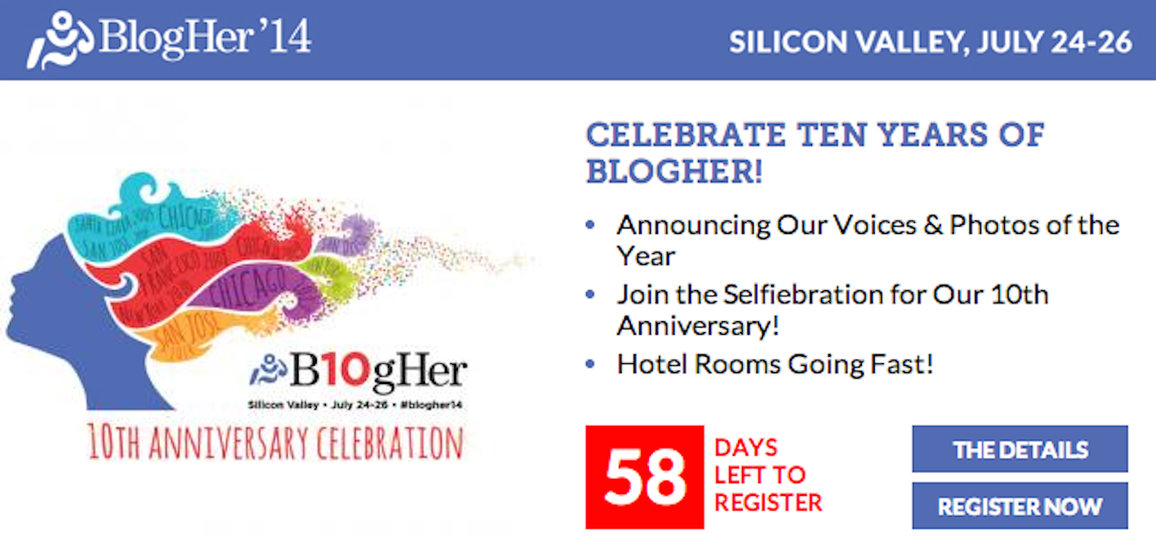 BlogHer will be celebrating its tenth anniversary this year from July 24th – 26th in sunny San Jose, California, or “Silicon Valley” as it is referred to in BlogHer press materials. This will probably be the best BlogHer of all time because they are actually allowing me to speak to a room of human beings for something like eight entire hours!! You really should come and check it out. Let me tell you why.