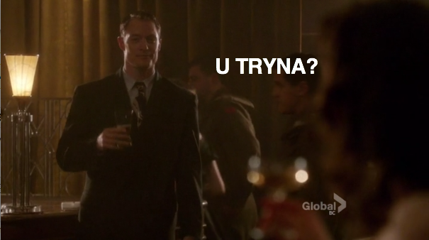 Gladys goes out with Fake Brit Worst Attempt At Accent Ever and it’s not going super well. First of all, they go to the Jewel Box because apparently there are no other night spots in Toronto. Now all their work friends and lesbian buddies could walk in at any time and spot this truly awful trainwreck of a date taking place. This is like my first and only date with a boy where we ended up going to a Chinese restaurant where the entire JV girls’ soccer team was seated next to us and watched the 16 year old awkward go down. In this case, we’re running the gamut from dead ex-boyfriends to ridiculous sounding British childhoods. Bond he is not, ladies and gentlemen.
