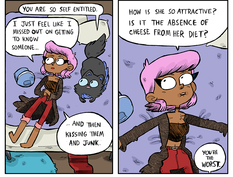 Her first comic, RentQuest, has ended, but it sure was a fun little ride. It’s about two roommates, Poppy and Noah. Poppy is a freelance warrior with a cute haircut and hairy legs. She’s not super motivated, not super great at being a warrior and not careful enough when she decides to go off on a quest to the appropriately named Ghoul Region. Noah is her roommate who can turn into five cats, but needs to have all five back together to turn back into a full human. He seems to have his life a little more together than Poppy, but, on account of him being not just one cat, but five, he’s also got a pretty bad attitude a lot of the time. If you’re looking for an exciting fantasy adventure comic with a fun punk sensibility, you’ve definitely come to the right place.