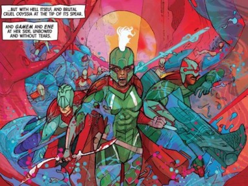 I mean, of course I’m excited about anything by Matt Fraction. And this one gets me even more excited, as it’s a futuristic retelling of The Odyssey, but starring a lady! Fraction himself has said that he wanted to write this to give his daughter a power fantasy, to be able to write a mythological adventure hero like Wonder Woman and “to stand in stark antithesis to that macho he-man (stuff)” like 300. ODY-C is about the journey home of Odyssia, a captain, warrior and mother and her crew after a ten year space war. Christian Ward is handling the art on this one, and it looks absolutely stunning. Exactly as weird and epic as a space story should be. Plus, Fraction is writing it in six syllable dactylic hexameter, just like Homer wrote the original Odyssey, because of course he is.