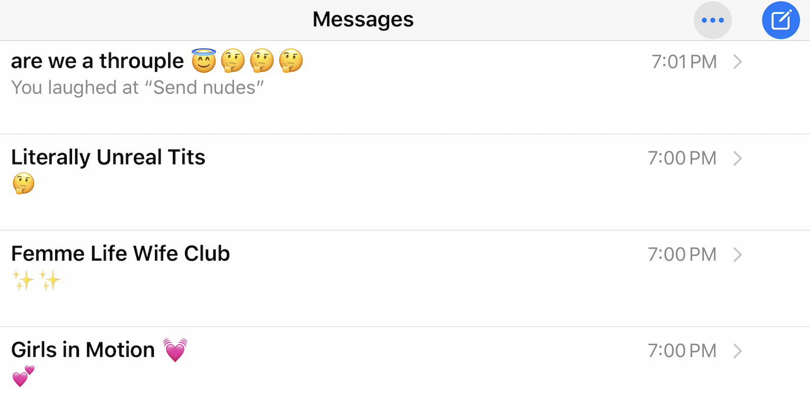 I personally always have a few group chats going on my phone: FAMILY (mom, dad, brother), FEMME LIFE WIVES (two of my best friends), FRIENDLY NUDES I (a group of babes who exchange casual nudes), FRIENDLY NUDES II (lol listen, I am who I am), SCHOOL PALS (self-explanatory), DO WE HAVE A MEETING THIS WEEK (work friends), and then a few other friend groups. You’ll notice some of these are grouped out of practicality (school, work, family) and some are grouped because people have either opted in or it just seemed natural to exist in digital space together. Sometimes a group chat springs up out of necessity for a specific project – a group birthday gift y’all are planning to go in on, an anniversary party multiple people are planning – and those often last the duration of the project and then fizzle out.