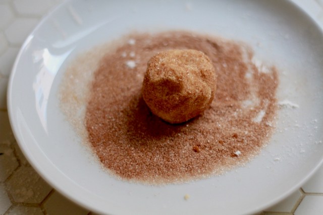 5. On a small plate whisk together the remaining sugar and the cinnamon. Now start rolling the little dough balls in the cinnamon sugar sands of happiness.