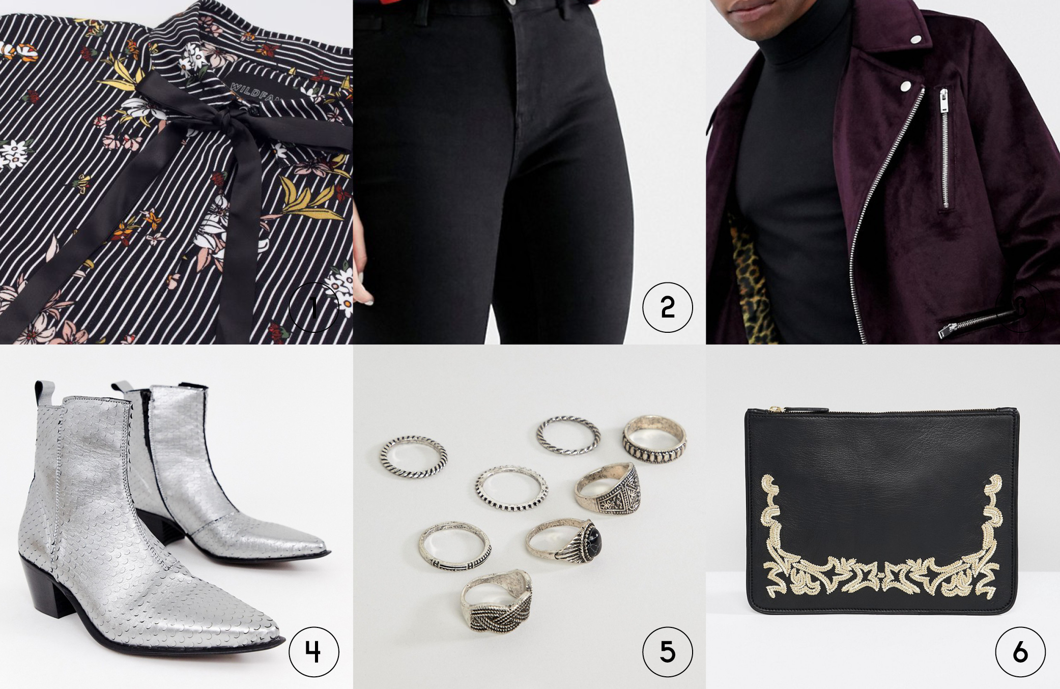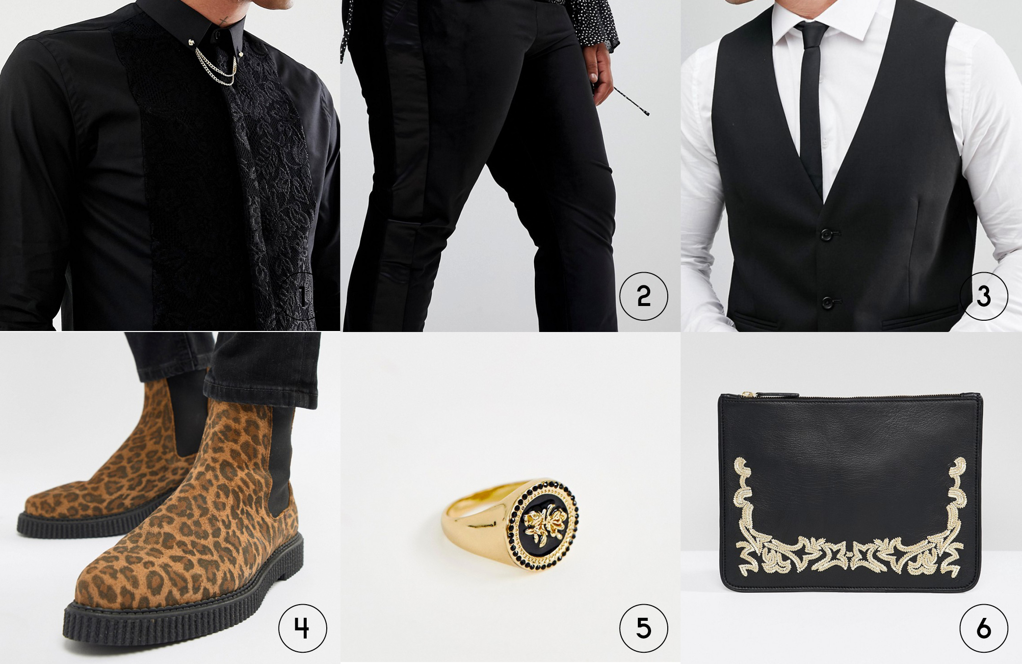 Because the outfit is still a little conservative in color, I picked these silver stacked-heel Chelseas for you because a monochromatic fit like this is perfect for these bad boys. Western style elements are really in this season, so if you do decide to wear the necktie you’re really gonna be on brand here. Finally, gay sprinkles! I picked this ring pack because the rugged look of them will add a nice touch to your fit and contrast with this embroidered clutch from ASOS also.