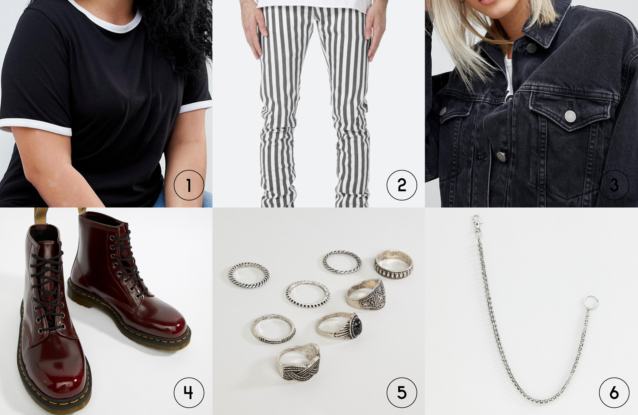 I started this fit with the pants. These striped stretch denim pants from MNML might give you some Beetlejuice vibes which is also, energetically, what I’m going for here. I’m pretty sure they come in pink if that’s more your vibe, but I went with the grey ones because to me they seem a little more flexible with your current wardrobe. You could recreate this entire fit also with any sort of patterned pant and you would also accomplish the same — think plaid, checker, etc. Pair these pants with this simple tee from ASOS to ground the outfit. Next, since we’re still doing Joan, we have to think boots! I picked these red Docs for you because the gloss finish really is going to make the outfit pop. And finally, if you like to overlay, an oversized washed-out denim jacket is a good alternative to leather. For accessories you can do rings, and/or add a chain to bring your inner bad queer out.