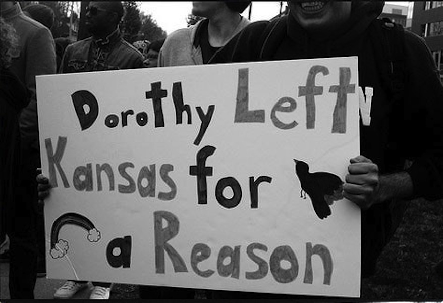 HB 2453 was borne out of fear of a marriage equality challenge in Kansas, which makes the state the first to attempt to obliterate the constitutional freedoms of thousands of people rather than just stand up in court and admit that they wanted to all along. As we’ve explored here before, marriage equality is not the first step to gay equality, and indicates nothing insofar as LGBT rights by state. So what does it say about gay rights in Kansas when lawmakers scramble to legalize discrimination rather than confront the reality of anti-gay discrimination at all levels occurring in their government, private economy, and personal lives? What does it mean for gay rights advocates in the state when one simple request — the right to marry — turns into a free-for-all on their human rights?