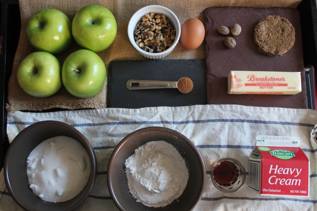 Pour the cream mix over the apples. If you find that it doesn’t all fit without leaking, I recommend that you take some of the apples out, or don’t use all of the cream. Because once it starts dripping it never stops. You  wind up with a scorched, smoking mess at the bottom of your oven, and no, it doesn’t just burn off. A baking sheet beneath the pie tin can be helpful in this situation, but only as a preventative measure.