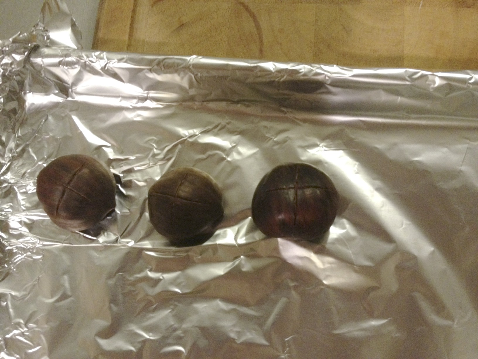 Why cut an x in the shells at all, you ask? Because if you don’t, science will make the chestnuts explode in your oven. This is not a thing you want, and if you have already discovered this the hard way please feel free to share the stories of this moment with me. We could create a support group. Make sure to puncture the shells all the way through, or science will say that you did not do this well enough and it will still make the chestnuts explode in your oven.