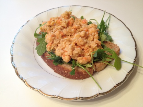 In a food processor, pulse the chickpeas until they are tiny pieces. Stop before it becomes hummus, but go until it looks kind of like tuna, about ten pulses. If you don’t have a food processor, you can do this with a fork and some patience.