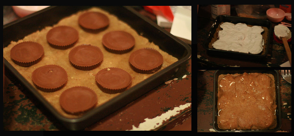 3. Once your dough is ready take 2/3 of it and press it into the baking dish. Make it thinner than you think you can. Trust me. Take your peanut butter cups and line then up evenly in rows. Next, take a bunch of fluff (the original recipe said 1 1/2 cups but to be honest I used almost an entire jar and I still think I could’ve used more) and spread it over the whole situation. Fluff is hard to spread so just do your best. The point is to cover the entire base with chocolate peanut butter cups or fluff or both.