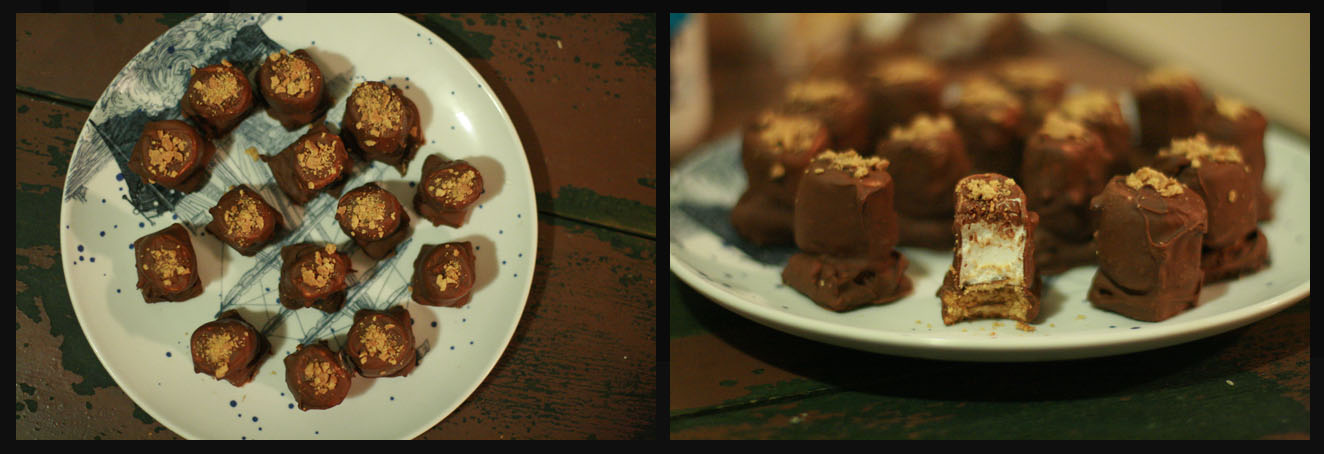 4. Get a long skewer. If you don’t have one use a knife, or chop sticks like I did. Poke the skewer/knife/chopstick into the top of the marshmallow and coat the entire thing — graham cracker, marshmallow — with melted chocolate. If you’re me you’ll get frustrated after a few tries and you’ll just use your hands. The tops of the marshmallows never get perfectly covered; don’t panic. Just use a spoon or your fingers and mush some extra chocolate on top.