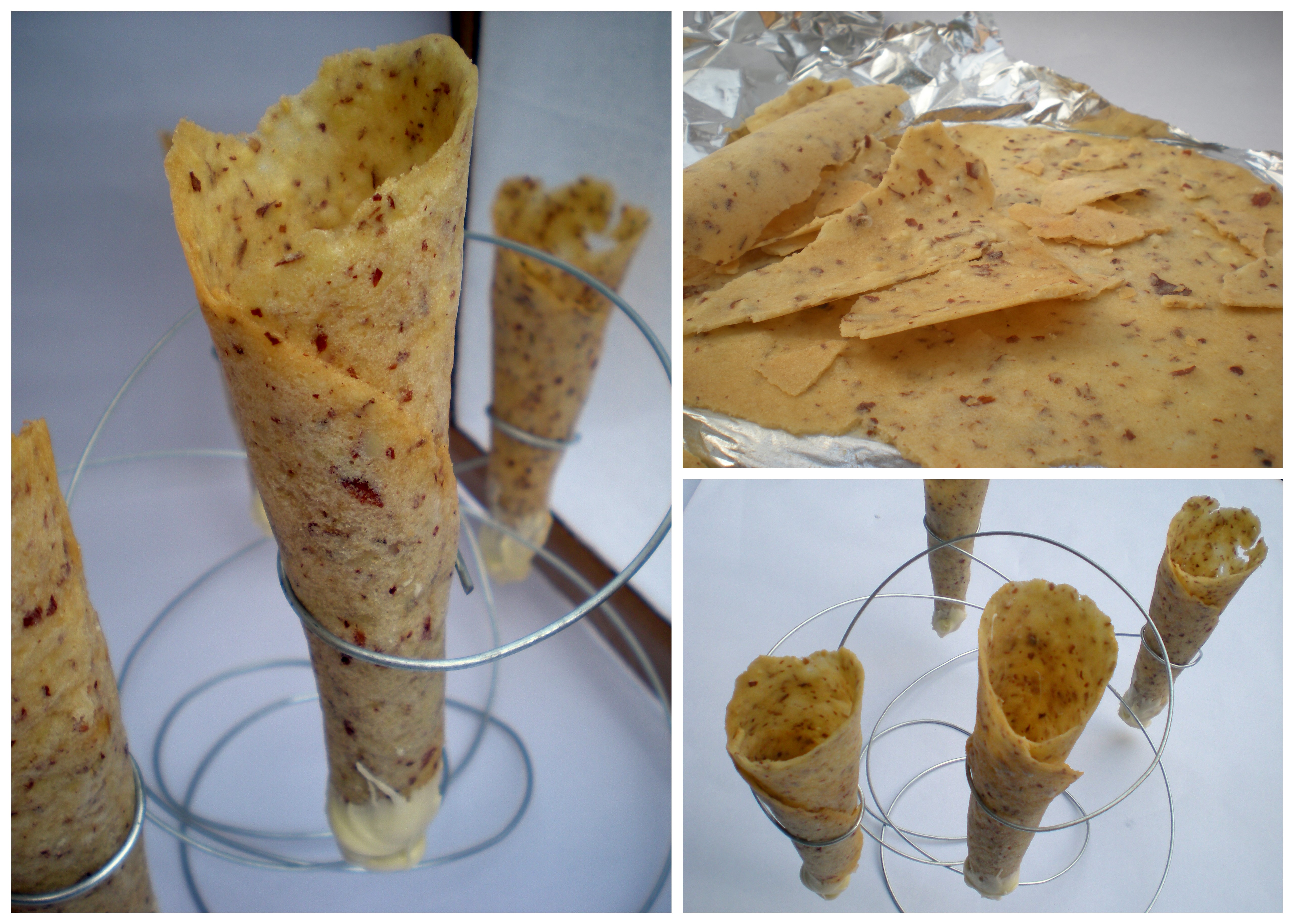 Spoon a little more than a tablespoon of batter onto the pan and spread into circles. The circles should be even and nearly translucent. Cook for at least 10 minutes; the cookies should be lightly browned or else they won’t hold their shape.