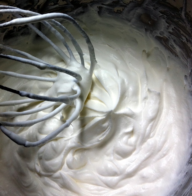 Meanwhile, whip the heavy cream until soft peaks form, transfer this to a separate bowl and reserve it in the fridge.