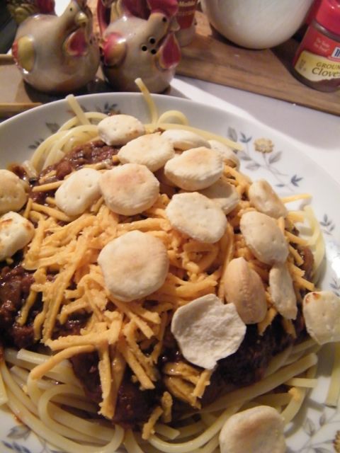9. Pile spaghetti with chili, cheese and oyster crackers to finish making the 3-way.