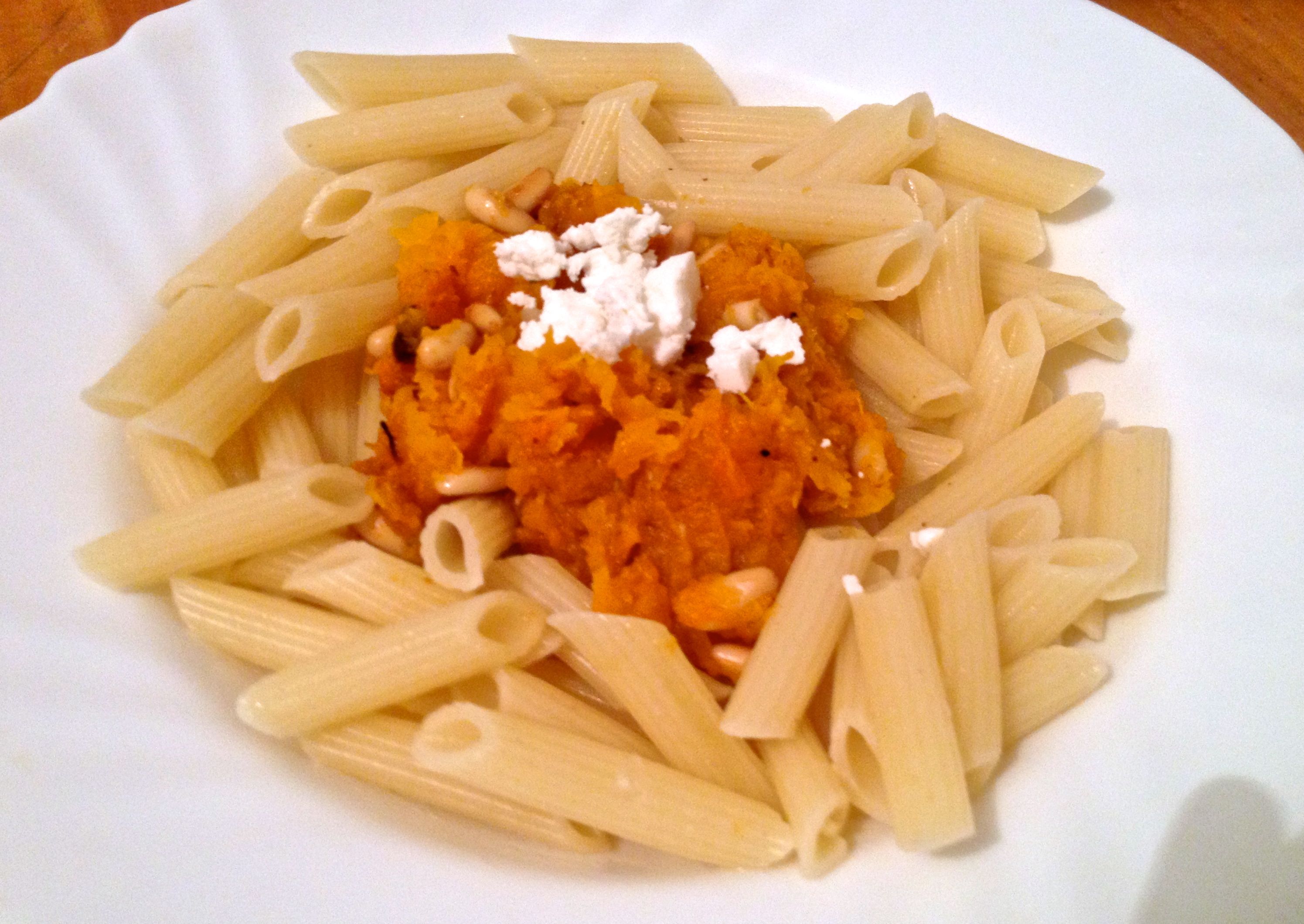 4. Divide the pasta and squash between four plates and sprinkle it with some salt, pepper and parmesan (we only had goat cheese but trust me, stick with parmesan).