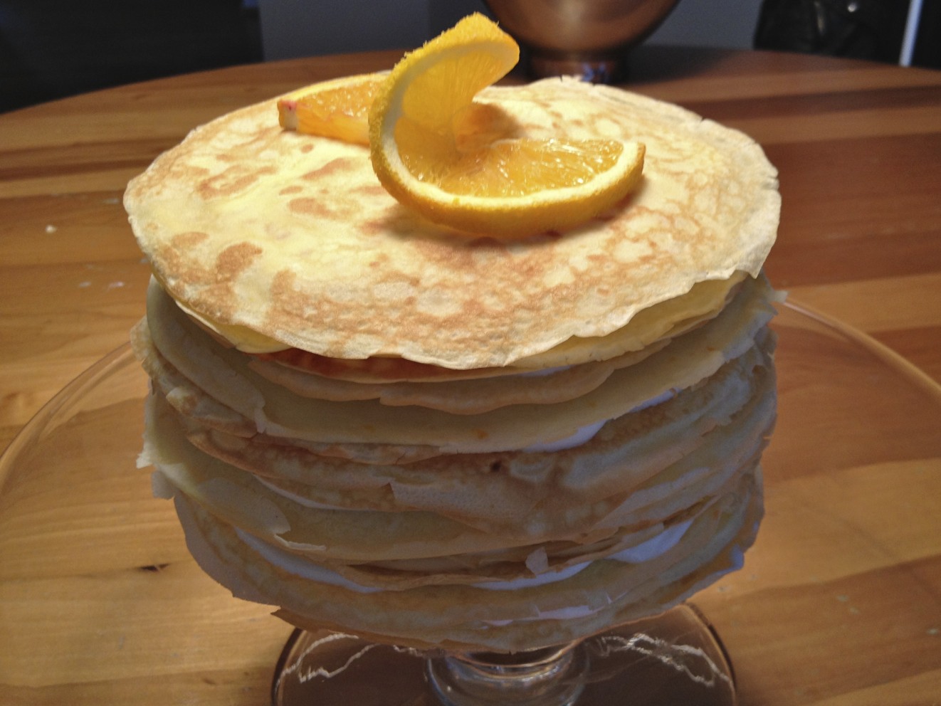 Now your ready to start stacking. Layer whipped cream and crepes until you’ve got a cake. Don’t forget to save your prettiest one for the top!