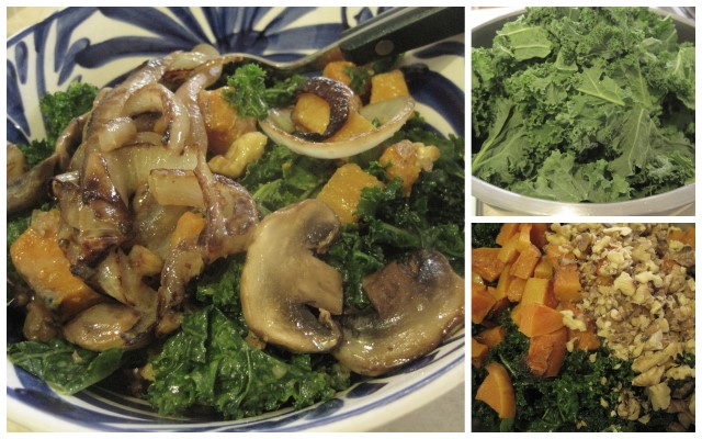 I would love to be one of those people who so enjoys eating salads that they just can’t bear to part with them in the dead cold of winter. In actuality, salads do not really feel like real food to me, and in winter all I want out of life is a bowl full of warm things, even if it is just “microwaved spaghetti-os.” But sometimes I realize it’s been three weeks since I ate anything green that wasn’t a Lifesaver, and also that my hands are sort of shaking and I might have scurvy, and oh look there’s a bunch of kale in the fridge, maybe I should eat that. But since eating a bowl full of cold greens when it’s eight degrees outside is depressing, here is a salad that’s nutritious and filling and (kind of) warm.