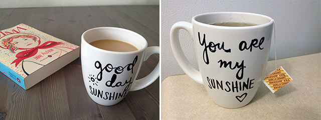 Porcelaine pens are meant to draw on ceramics specifically, so the designs stay on a lot better than Sharpies. I made Zeller a pair of mugs for Valentine’s Day last year and after washing them about once a week since, they still hold up beautifully. I even drew on the inside of one mug and it hasn’t scratched at all. The one says, “I love tea and coffee and you!” because I’m a sap. You can buy them for around $3-$5 at any craft store (they’re usually located back by the glass paint).