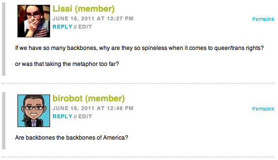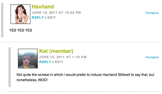 Hello lesbians and straight men pretending to be lesbians on the internet. What a week, eh? (See that? I’m channeling Emily Choo for you). Laneia and Sarah F P*lmer have returned from Bonaroo, appear to have had a ball, and Crystal wants to know your top 5 concert experiences. Grace wrote her very first post about the Tonys and Lizz talked about really cute vintage bathing suits for grrrls and bois. The IFCland, Jess interviewed Romi and Riese recapped The Real L Word and then wrote about why Ilene is such a complete loser.